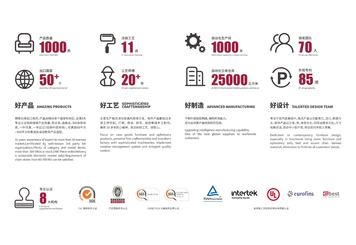 企業以產品為載體創造出產品本身的價值點,設計出時尚、北歐現代的家居風格,以高質量、高性價的工藝打造產品營銷市場遍布全球,為上百個知名品牌提供代加工服務,“客戶導向,專注專業”是企業的營銷理念,由服務與產品成就未來,為您品牌增添優勢,創造價值。主要生產板木家具與沙發類軟體家具,板木類家具已實現60%的自動化,40%來自于手工制作企業經歷了兩代人的發展,一直致力于創造奏啟發性的家居設計。