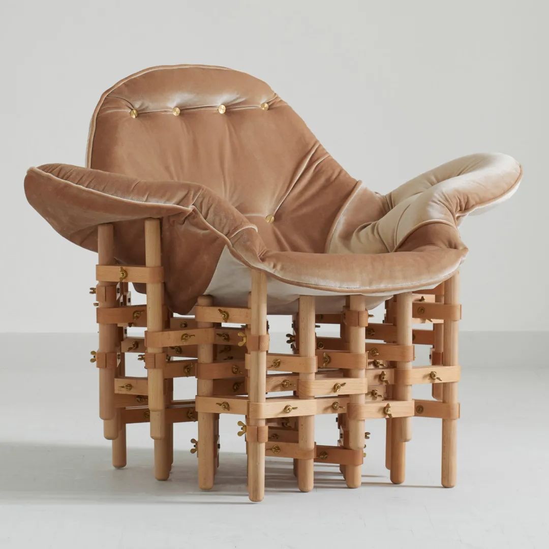 這個(gè)由設(shè)計(jì)師Marija Puipait?和Vytautas Ge?as設(shè)計(jì)的“設(shè)想的舒適”家具系列中簇絨,粉紅色天鵝絨座椅下垂在互鎖的木銷(xiāo)上。