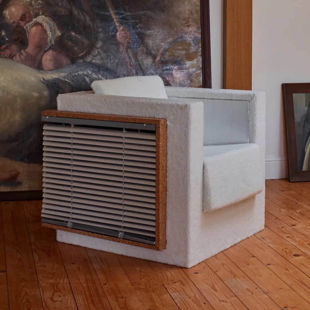EJR Barnes用長(zhǎng)方百葉窗包裹了這個(gè)長(zhǎng)方體形的椅子,百葉窗插入其側(cè)面和背面,并以軟木窗框做邊界。