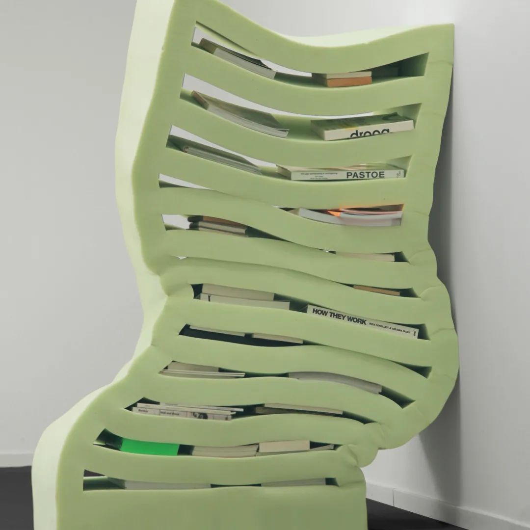 荷蘭設(shè)計(jì)師Dewi van de Klomp用綠色和粉紅色的泡沫橡膠制成了這些彎曲的架子,綠色和粉紅色的泡沫橡膠通常用于緩沖汽車(chē)座椅和墻壁的隔熱材料。